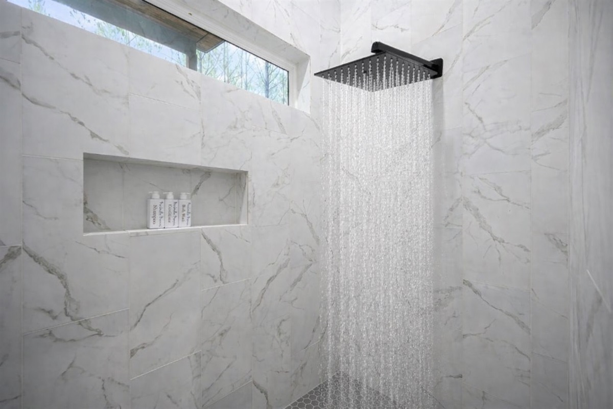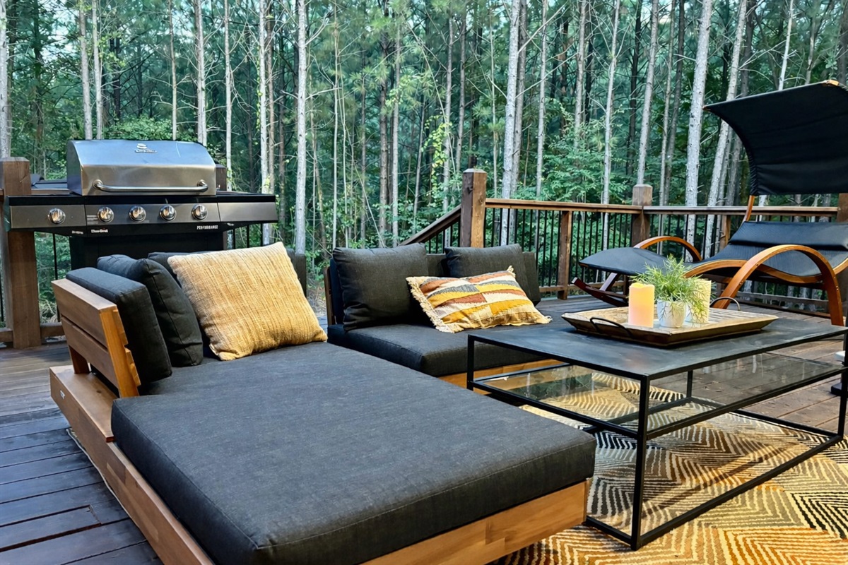 Relax in the living room and cuddle up or s-t-r-e-t-c-h out on a 10 foot velvet sofa and stream your fav shows. The beautiful vaulted ceiling and stack stone feature wall with gas fireplace add a sophisticated ambiance. If it happens and work calls or that impromptu zoom sneaks in, there is a desk for your laptop, fast wifi and a view of the pines! Reconnect with your inner child or with each other and enjoy some couples/games provided. NOTE: Our TVs are Smart TVs so that you can log in with your account and watch your shows via your favorite apps.